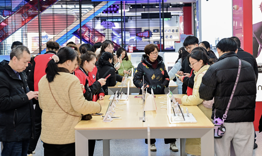 2026年“新國(guó)補(bǔ)”落地,消費(fèi)者在重慶京東MALL選購(gòu)手機(jī)。(受訪者供圖)