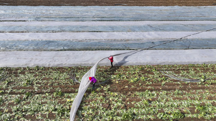 2025年12月11日,在山東省東營市廣饒縣李鵲鎮(zhèn),農(nóng)民為作物覆蓋防寒無紡布,應(yīng)對寒潮(無人機照片)。