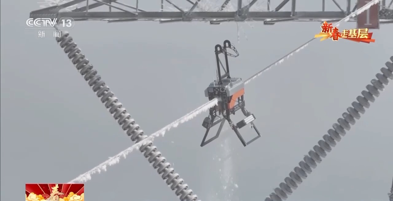 不斷旋轉(zhuǎn)的履帶,是它的雙腳。它一邊快速向前,一邊擠壓導(dǎo)線上的覆冰。1分鐘左右,20多米長的導(dǎo)線,覆冰全部被清理干凈。