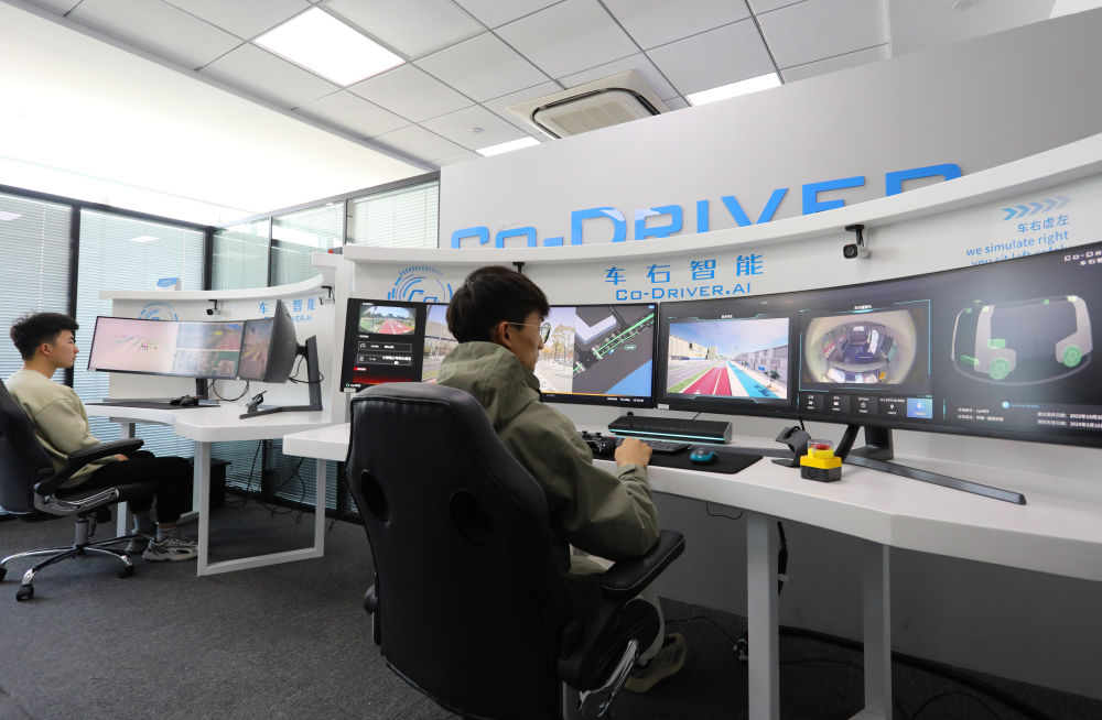 在位于中國(guó)(上海)自由貿(mào)易試驗(yàn)區(qū)臨港新片區(qū)的一家智能駕駛企業(yè),工作人員通過無(wú)人駕駛汽車遠(yuǎn)程監(jiān)管平臺(tái)的實(shí)時(shí)畫面,結(jié)合電子地圖對(duì)在自動(dòng)駕駛測(cè)試專用路上行駛的車輛進(jìn)行監(jiān)管(2024年4月9日攝)。
