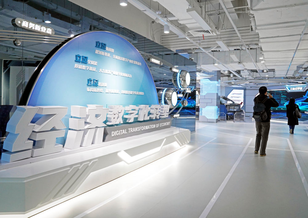 觀眾在位于上海市楊浦區(qū)景星路的上海城市數(shù)字化轉型體驗館參觀(2023年4月7日攝)。該館展示上海各方面數(shù)字化轉型的規(guī)劃布局和最新實踐。