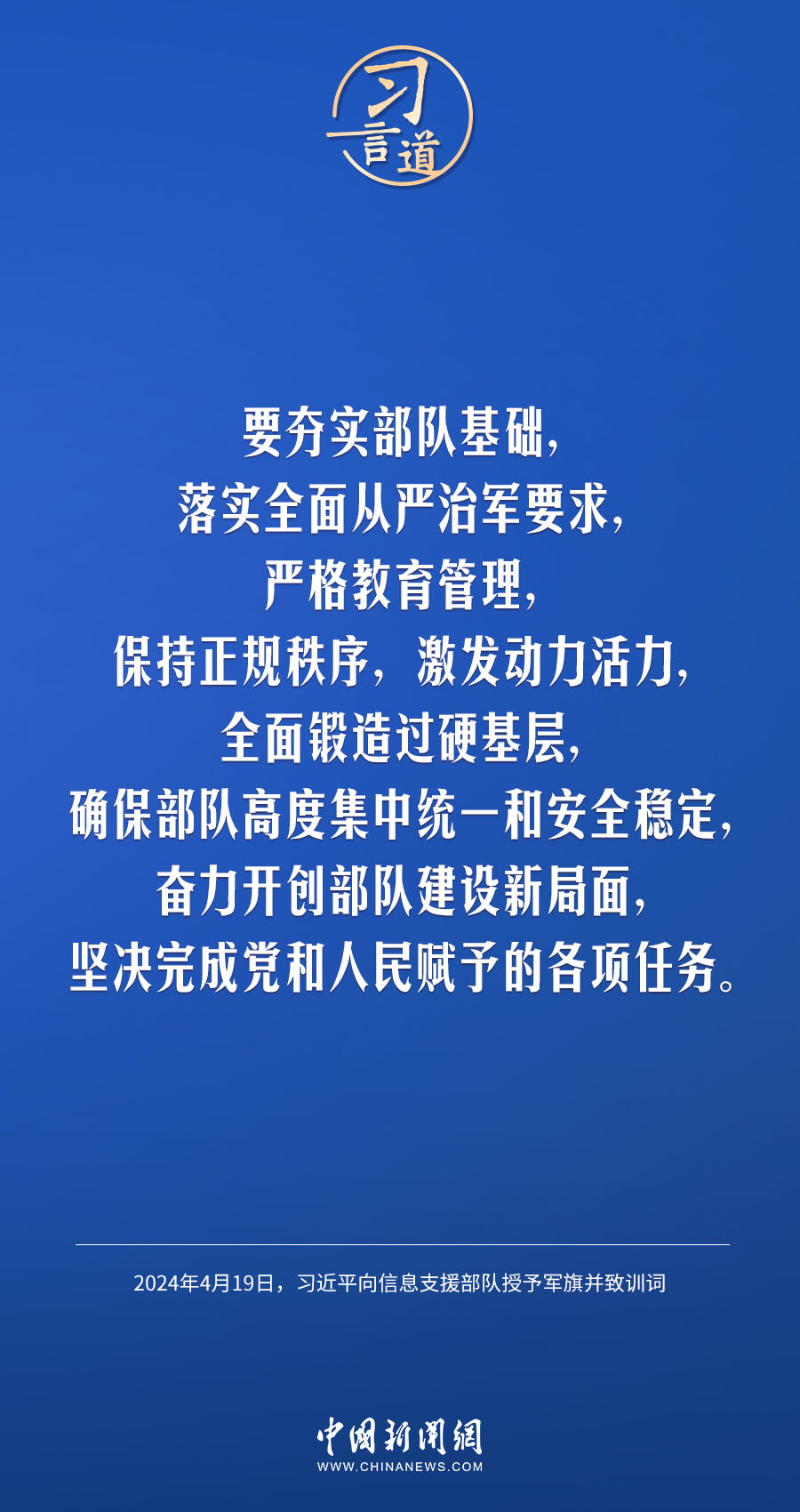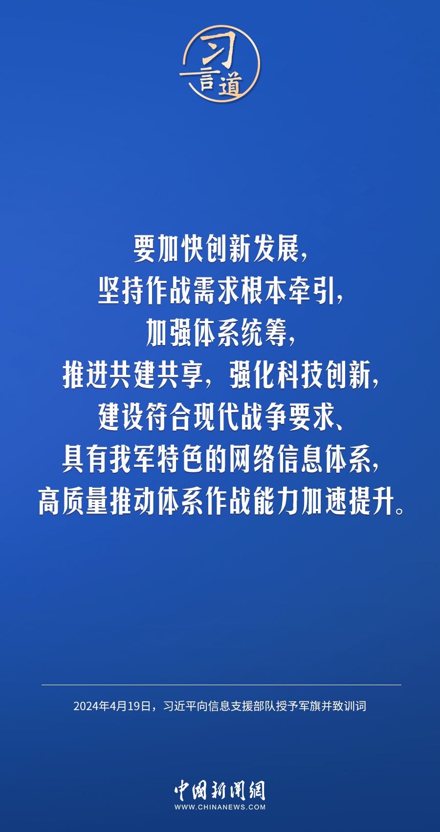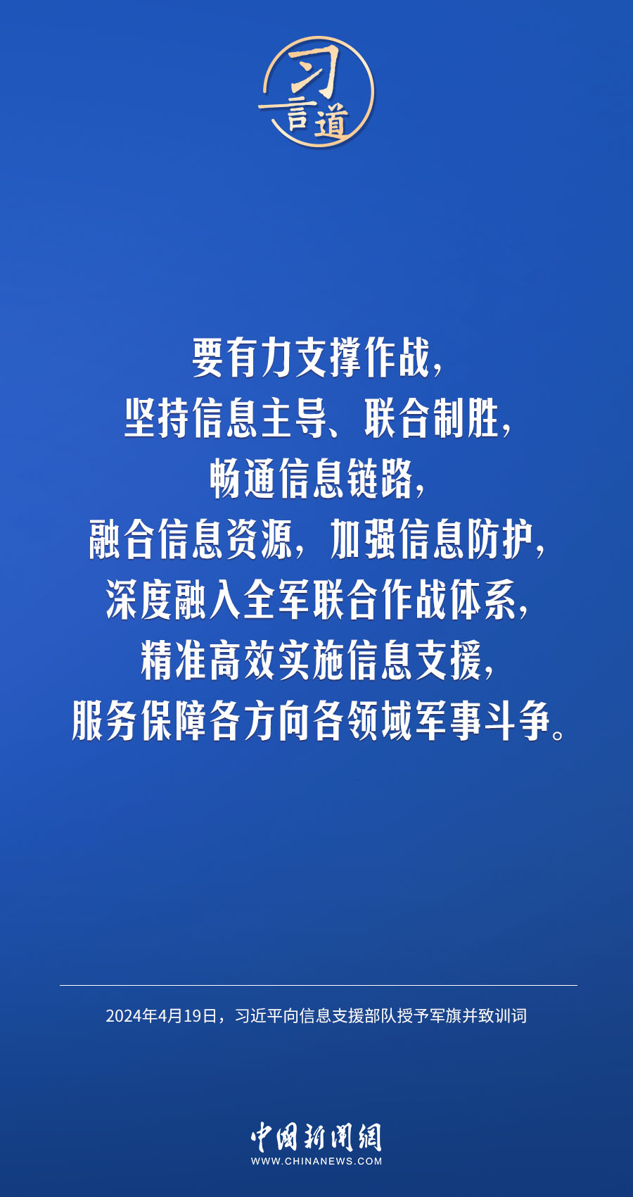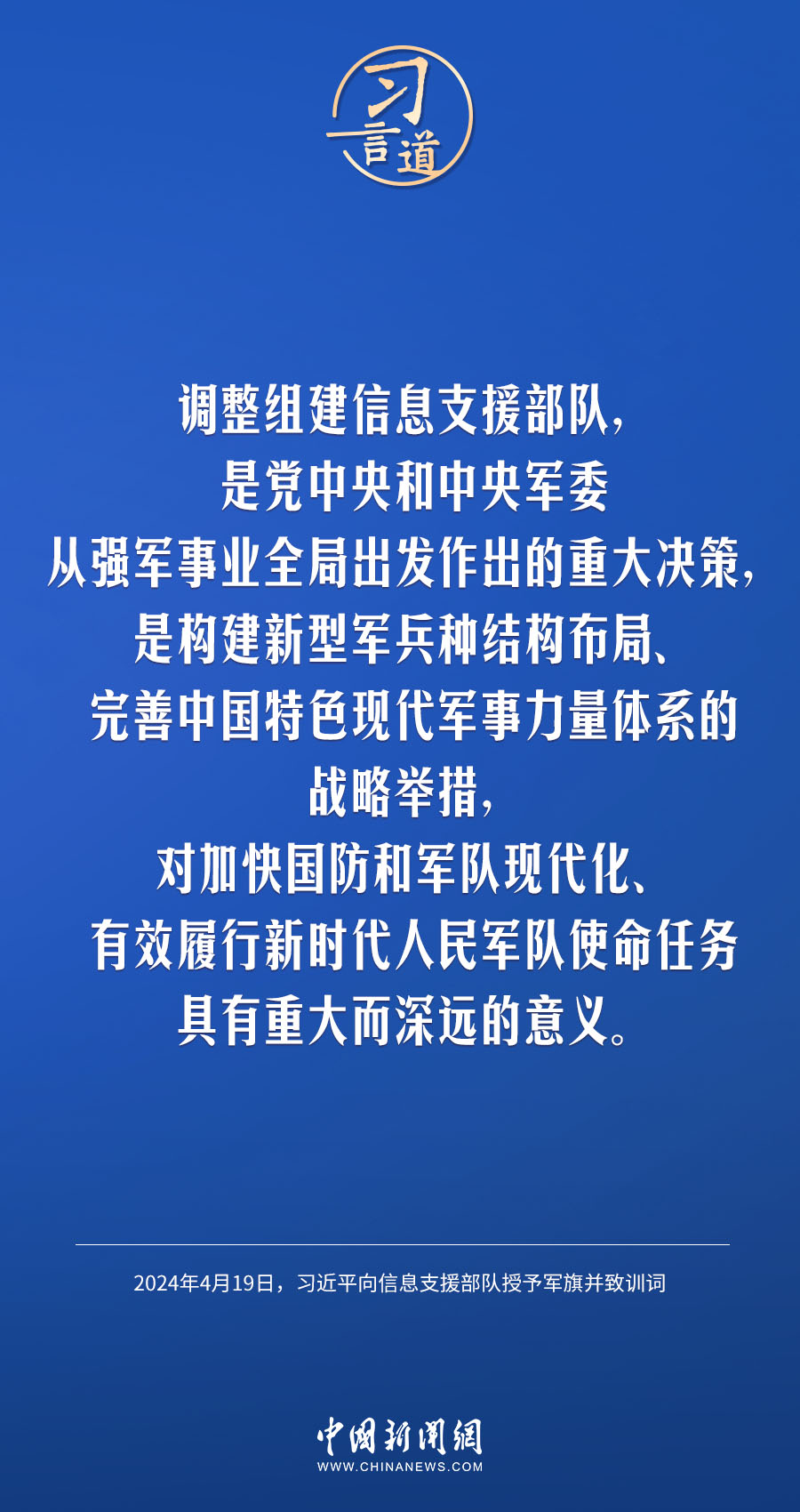 中國人民解放軍信息支援部隊成立大會19日在北京八一大樓隆重舉行。中共中央總書記、國家主席、中央軍委主席習近平向信息支援部隊授予軍旗并致訓(xùn)詞,代表黨中央和中央軍委向信息支援部隊全體官兵致以熱烈祝賀。他強調(diào)——