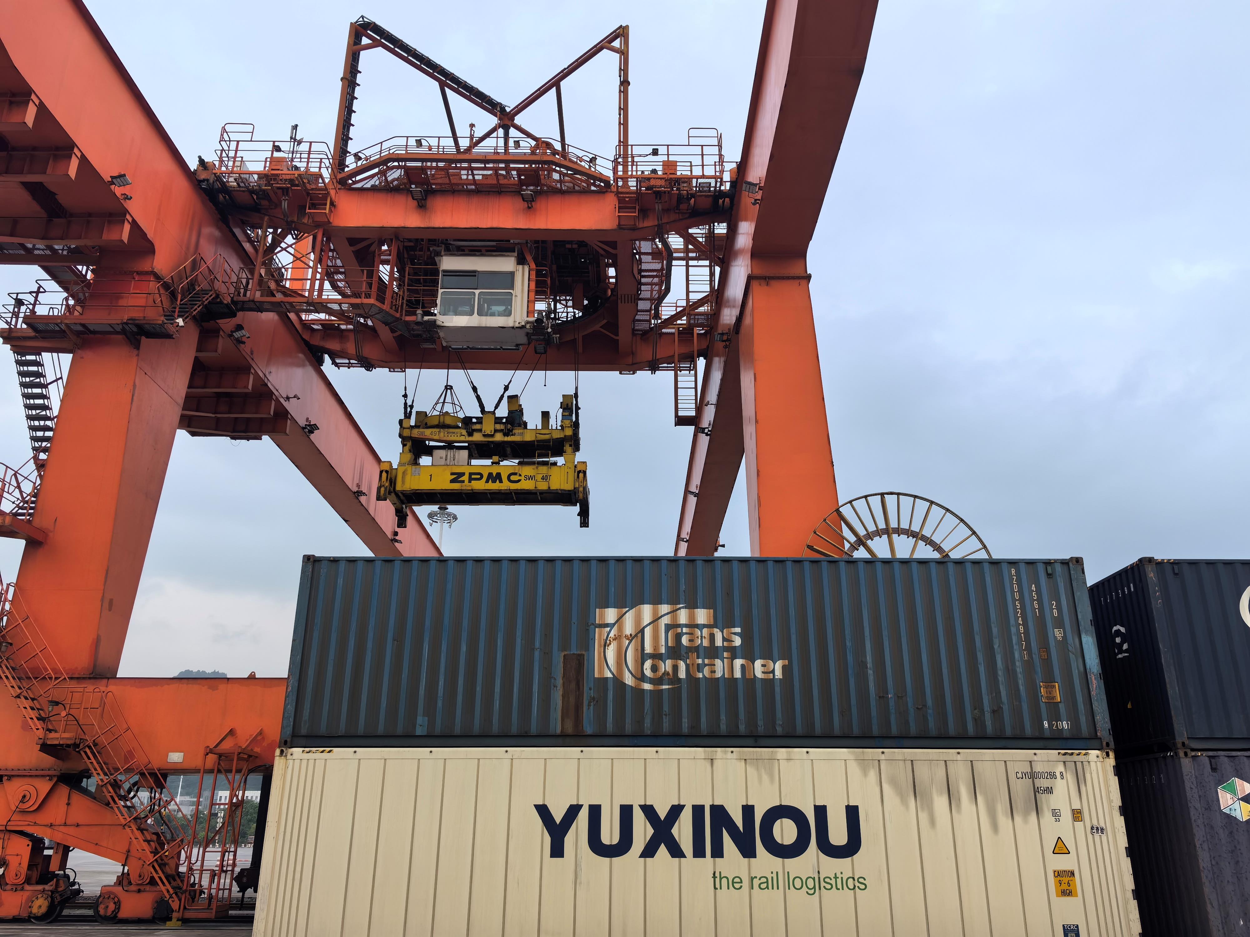 重慶國際物流樞紐園區(qū)內(nèi),中歐班列運(yùn)送的“渝新歐”集裝箱整齊排列。(總臺央廣記者潘毅拍攝)
