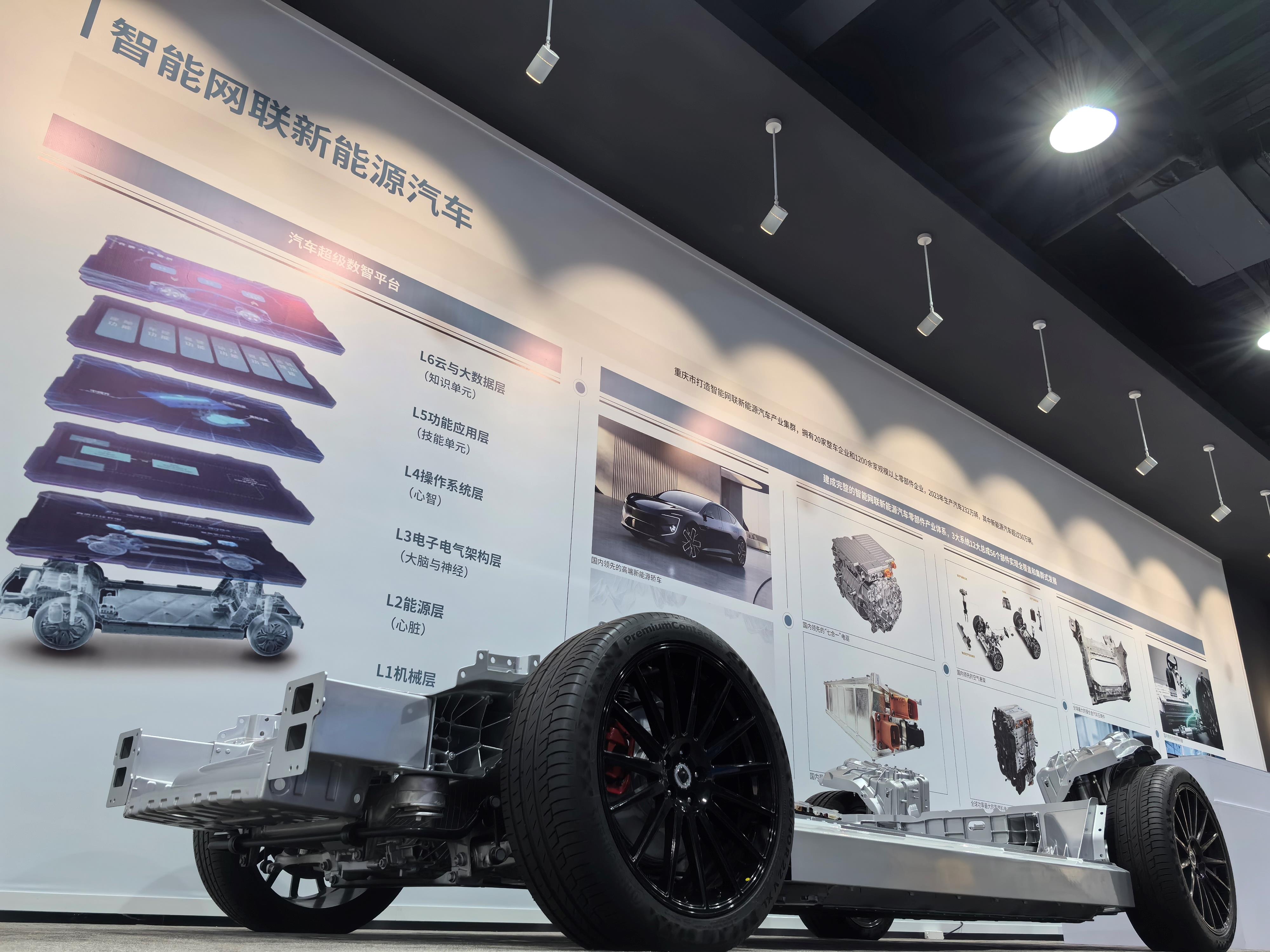 在重慶市科技創(chuàng)新和產(chǎn)業(yè)發(fā)展成果展示上的智能網(wǎng)聯(lián)新能源汽車部件。(總臺央廣記者潘毅拍攝)