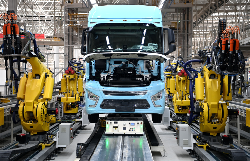 △ 一輛重卡在汽車總裝生產(chǎn)線輪胎自動化裝配擰緊無人工作站進行裝配。