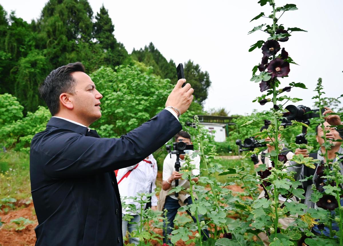 2024年4月23日,國際園藝生產(chǎn)者協(xié)會主席萊昂納多·卡皮塔尼奧在成都市金堂縣鮮花山谷景區(qū)考察蜀葵產(chǎn)業(yè)。