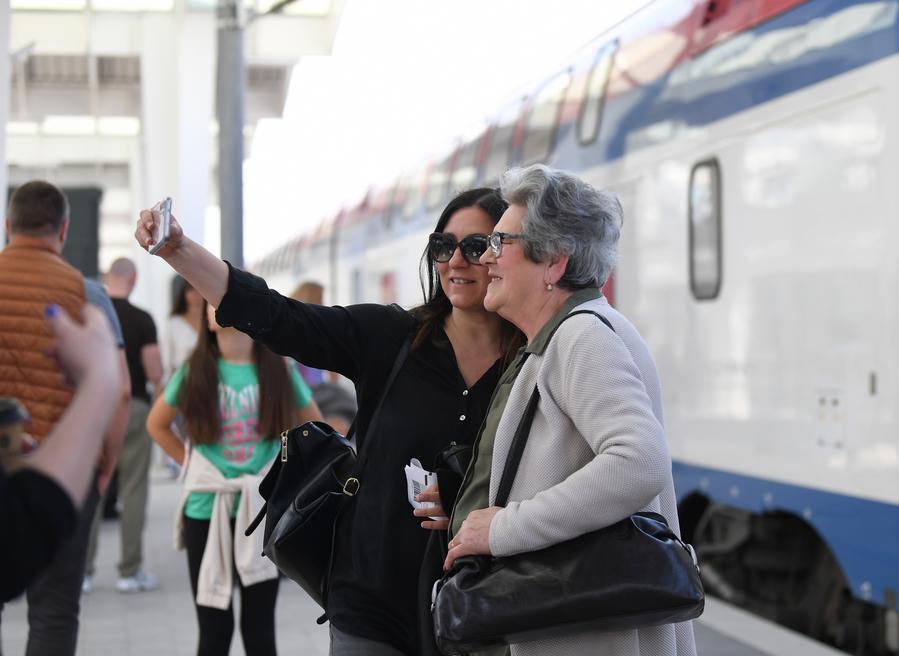 2023年5月6日,在塞爾維亞諾維薩德火車站,乘客在開往貝爾格萊德的列車前自拍。新華社記者任鵬飛攝