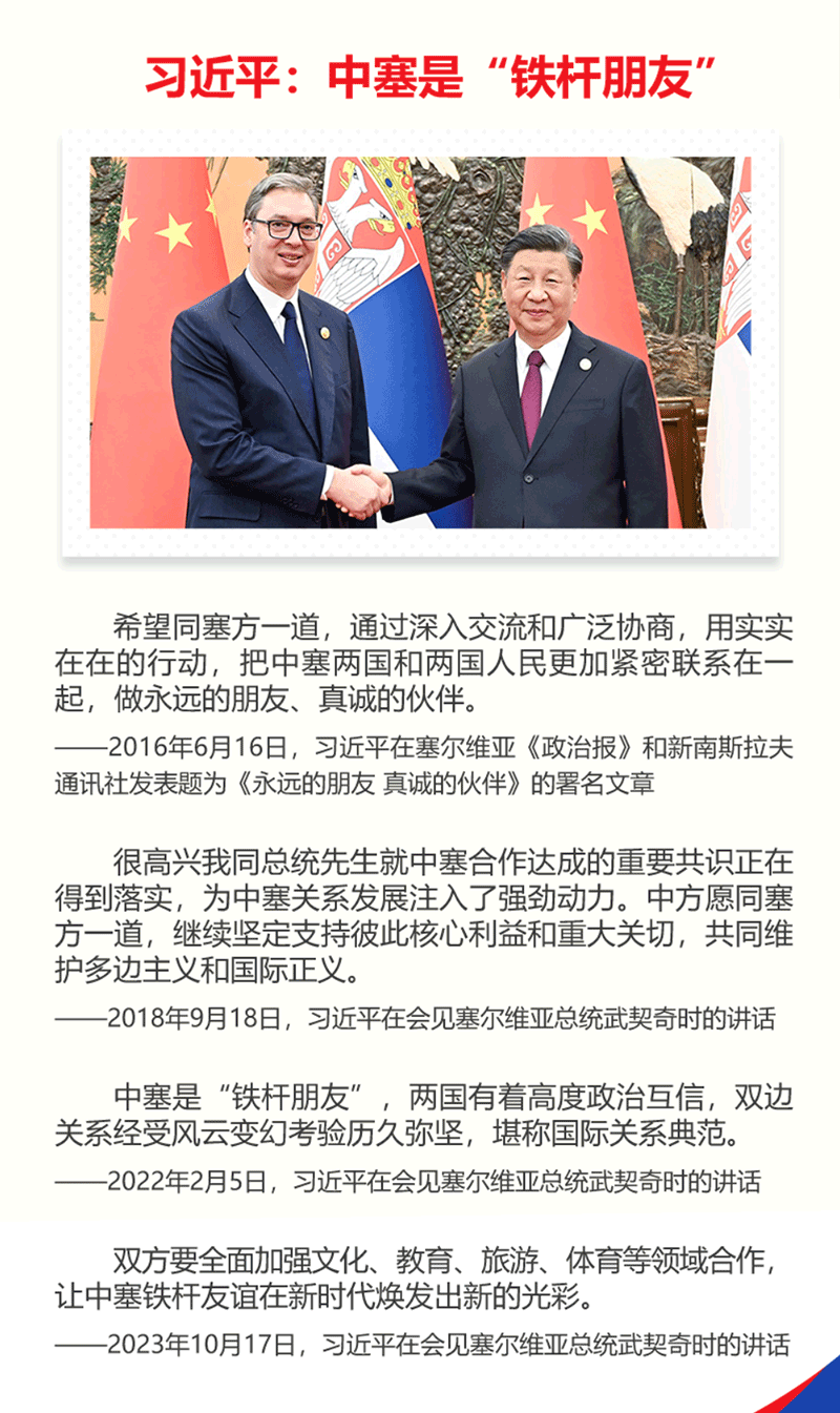 這是時隔近八年,習(xí)主席再次對塞爾維亞進行國事訪問。中塞是“鐵桿朋友”,習(xí)主席指出,希望同塞方一道,通過深入交流和廣泛協(xié)商,用實實在在的行動,把中塞兩國和兩國人民更加緊密聯(lián)系在一起,做永遠的朋友、真誠的伙伴。
