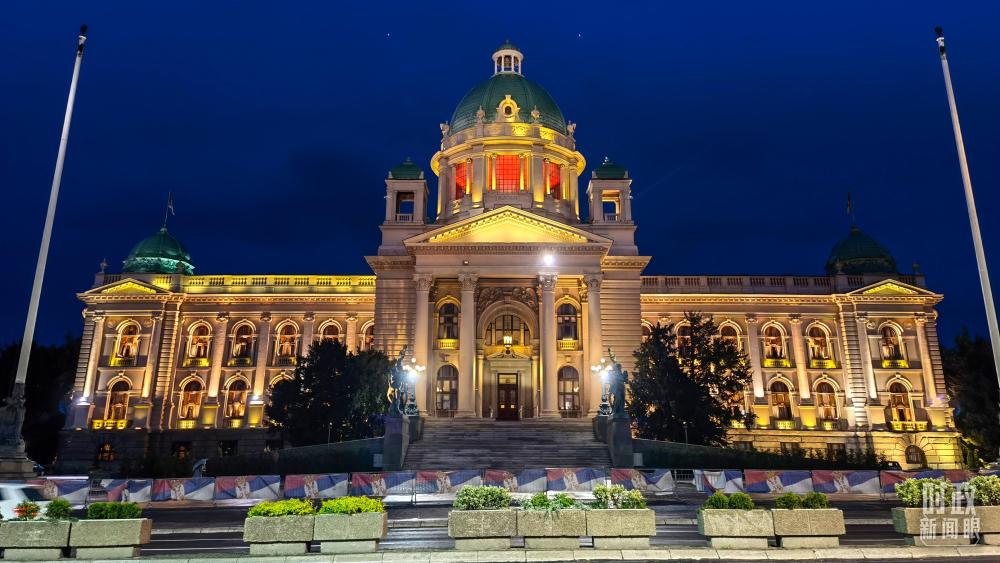 塞爾維亞國會(huì)大廈亮起紅燈,歡迎習(xí)主席到訪。(總臺(tái)央視記者石丞拍攝)