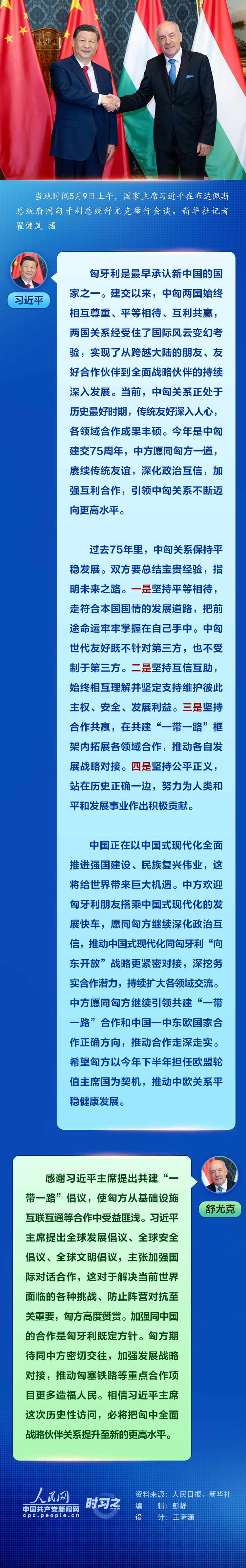 當?shù)貢r間5月9日上午,國家主席習近平在布達佩斯總統(tǒng)府同匈牙利總統(tǒng)舒尤克舉行會談。習近平指出,今年是中匈建交75周年,中方愿同匈方一道,賡續(xù)傳統(tǒng)友誼,深化政治互信,加強互利合作,引領中匈關系不斷邁向更高水平。