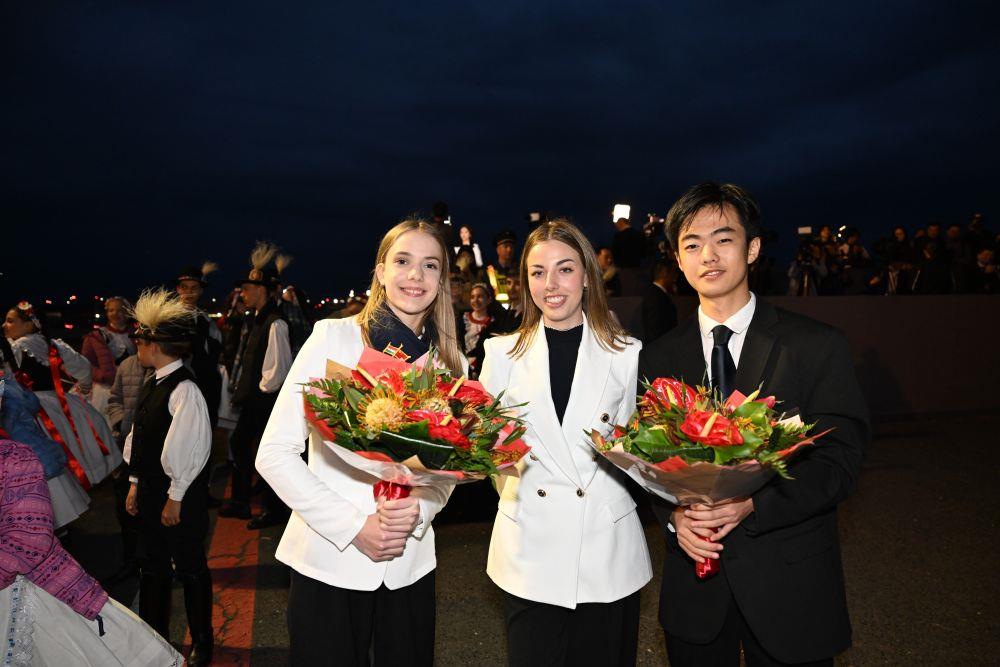 當?shù)貢r間5月8日晚,在匈牙利布達佩斯國際機場,匈牙利姑娘歐拉·塔瑪拉(中)與匈中雙語學校兩名參加歡迎儀式的學生合影。