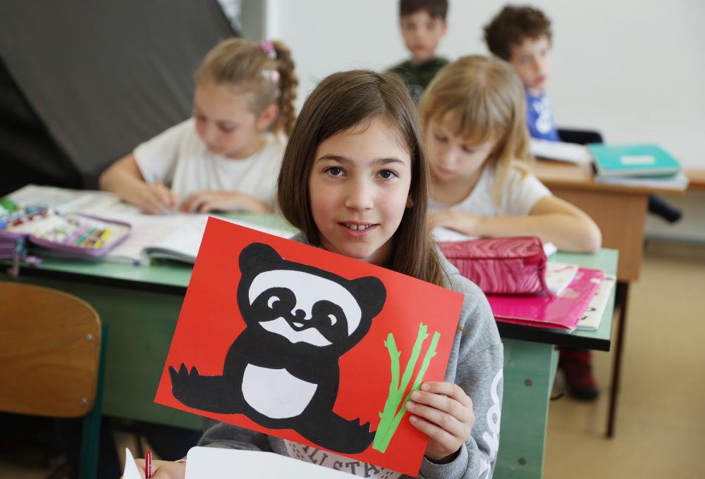 2024年5月3日,匈中雙語學校三年級學生寶怡展示自己的大熊貓形象美術(shù)作品。