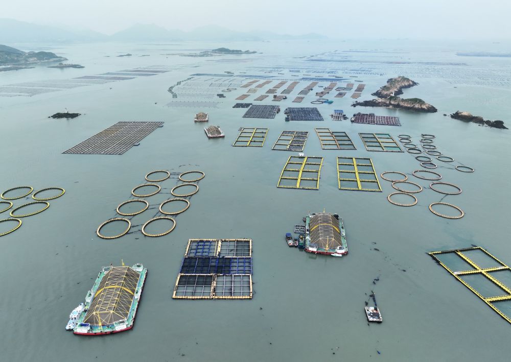 在福建連江定海灣海域,坐落著“定海灣1號”“定海灣2號”等深遠海養(yǎng)殖平臺(2024年5月7日攝,無人機照片)。新華社記者 林善傳 攝