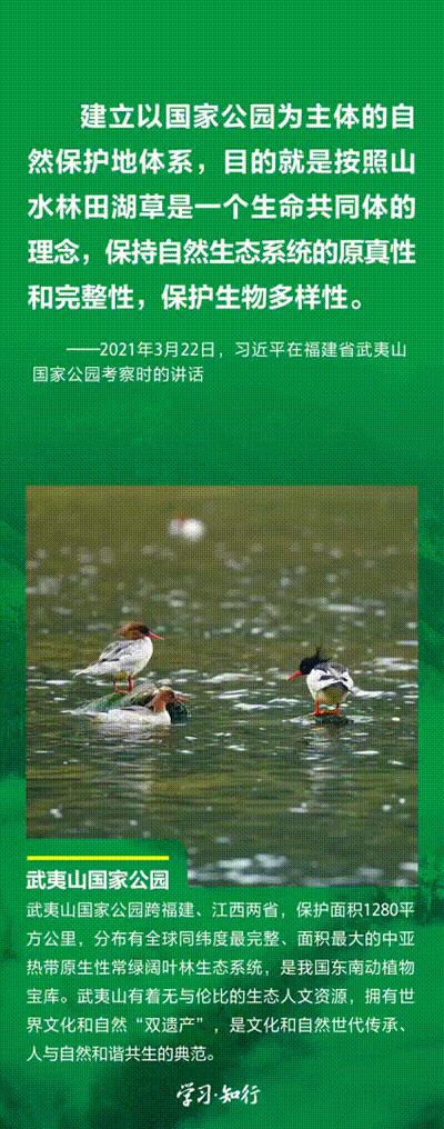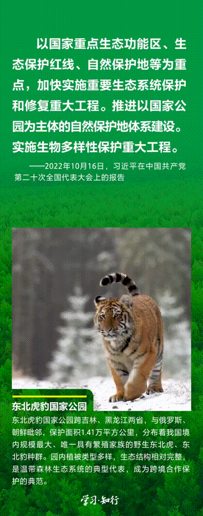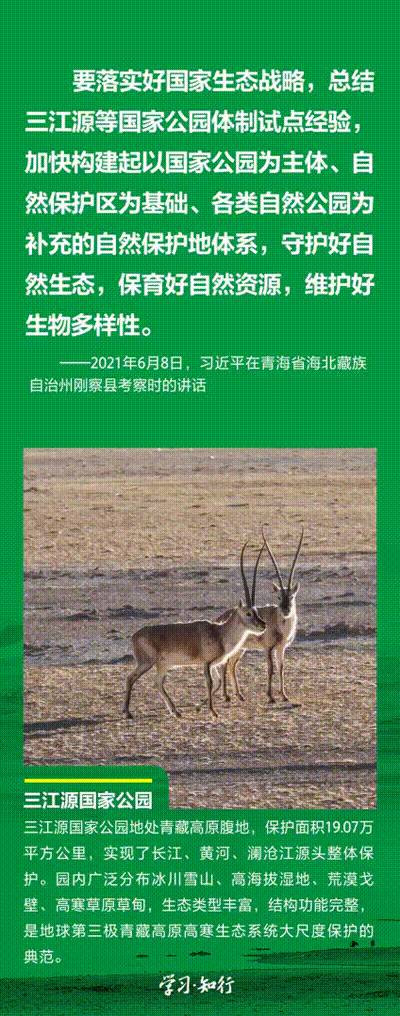 “生物多樣性使地球充滿生機(jī),也是人類生存和發(fā)展的基礎(chǔ)。”推進(jìn)以國(guó)家公園為主體的自然保護(hù)地體系建設(shè),是習(xí)近平總書記作出的重要部署。三江源、大熊貓、東北虎豹、海南熱帶雨林、武夷山等首批國(guó)家公園正式設(shè)立以來(lái),生態(tài)功能持續(xù)向好,對(duì)保護(hù)生物多樣性、推進(jìn)人與自然和諧共生的現(xiàn)代化具有重要意義。