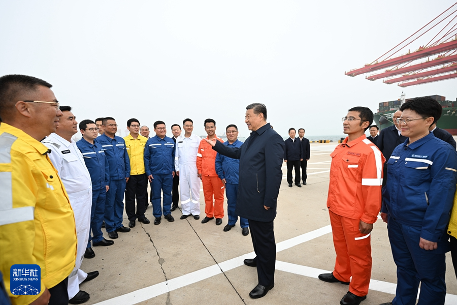 5月22日至24日,中共中央總書(shū)記、國(guó)家主席、中央軍委主席習(xí)近平在山東考察。這是22日下午,習(xí)近平在日照港親切慰問(wèn)港口科技工作者、運(yùn)營(yíng)人員、航運(yùn)人員。新華社記者 鞠鵬 攝