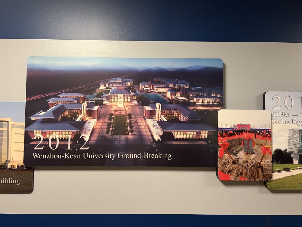 在美國肯恩大學主校區(qū)學生中心走廊內懸掛的溫州肯恩大學奠基儀式的照片。