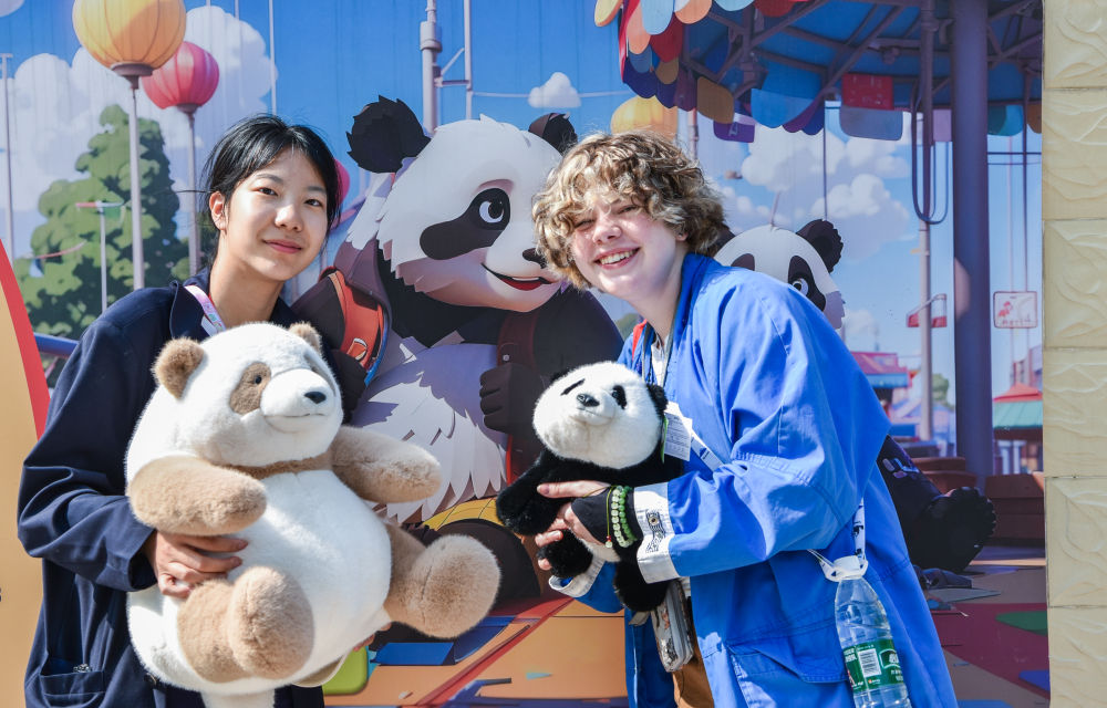 4月21日,中美學生在石家莊動物園大熊貓館內手持熊貓玩偶留影。