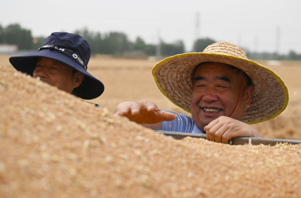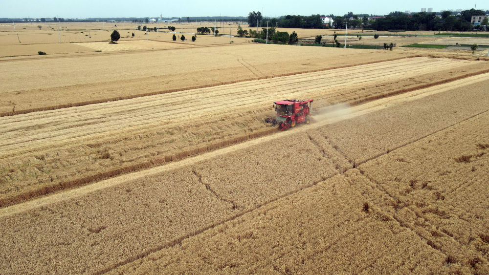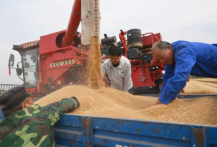 麥?zhǔn)諘r節(jié),在安徽阜陽太和縣,機(jī)器轟鳴,麥浪翻滾如金色綢緞,飽滿的麥粒裝滿一輛輛運(yùn)糧車的貨廂。