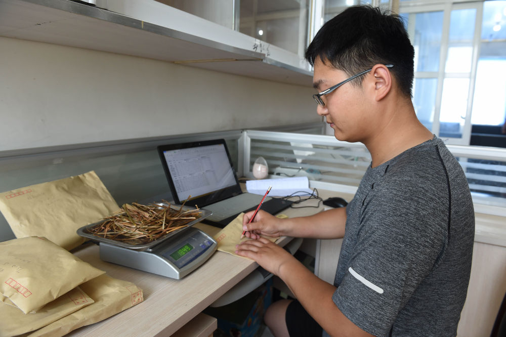 2022年6月28日,在太和縣淙祥現(xiàn)代農(nóng)業(yè)種植專業(yè)合作社,徐旭東在實驗室對農(nóng)作物樣品進(jìn)行稱重和記錄。