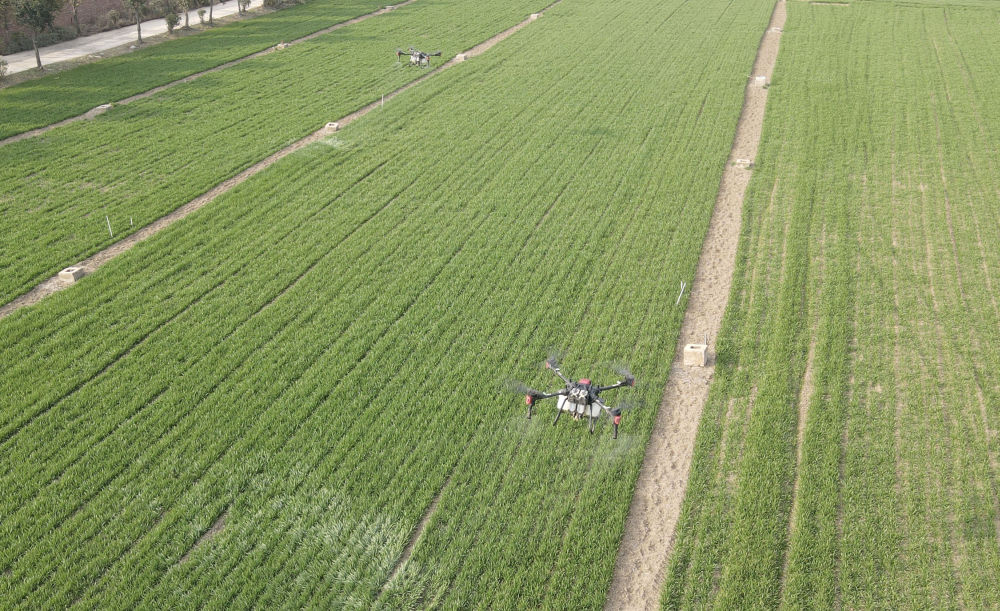 2023年2月21日,在太和縣淙祥現(xiàn)代農(nóng)業(yè)種植專業(yè)合作社,無人機(jī)噴灑農(nóng)藥(無人機(jī)照片)。