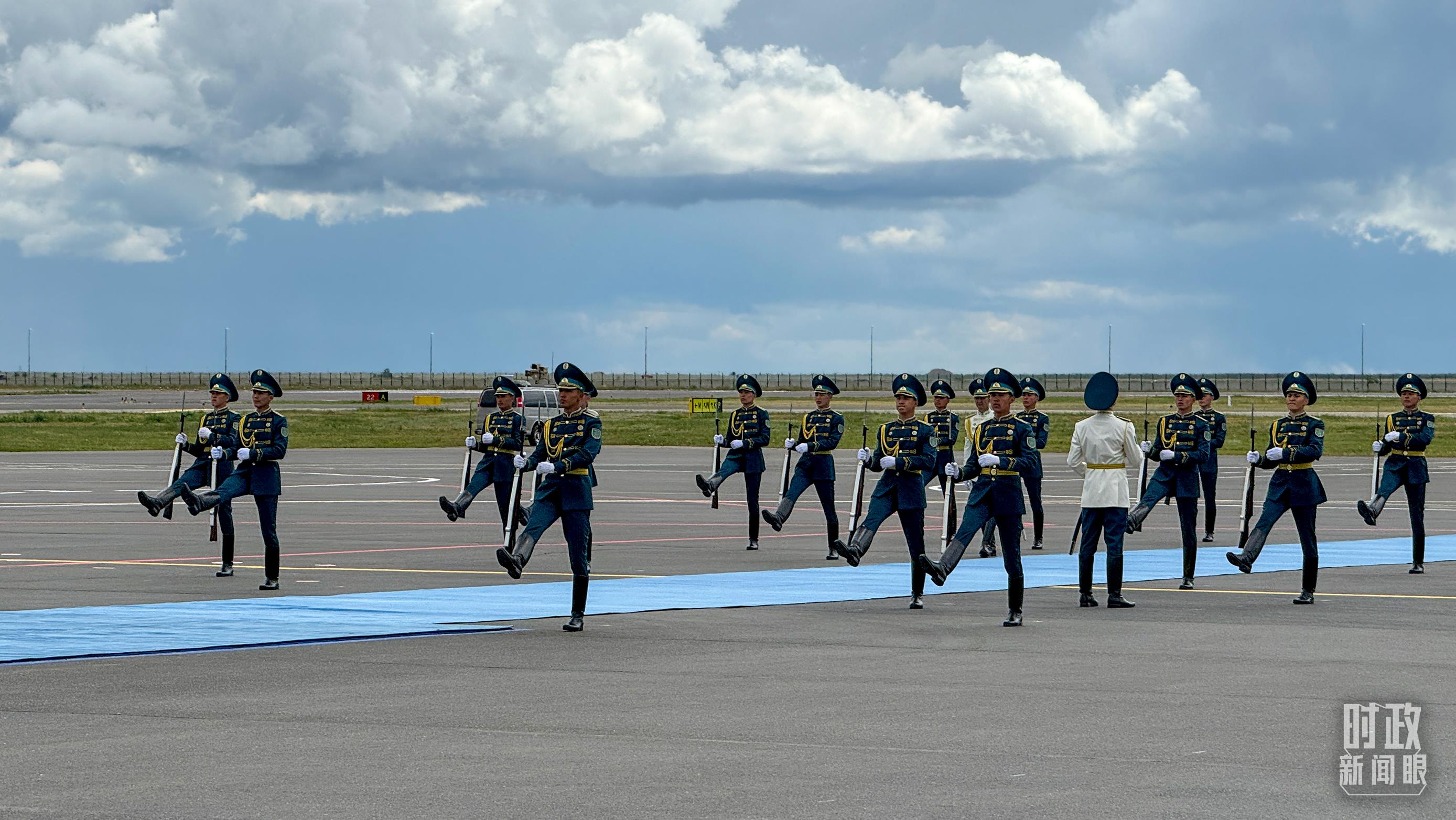 托卡耶夫總統(tǒng)在機(jī)場(chǎng)為習(xí)主席舉行了盛大隆重的迎賓儀式。100余名儀仗兵英姿挺拔,軍樂(lè)團(tuán)奏響迎賓曲和迎賓號(hào)角。近百名哈薩克斯坦兒童揮舞中哈兩國(guó)國(guó)旗,歡呼“您好”,熱烈歡迎習(xí)主席到訪。