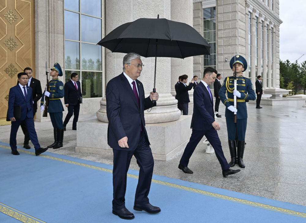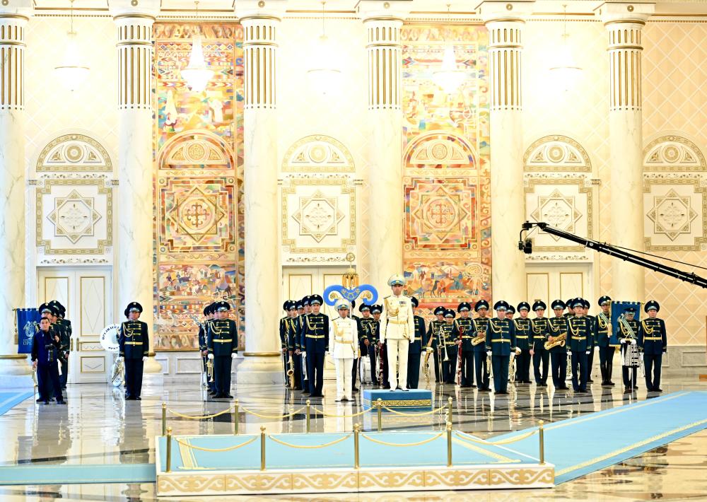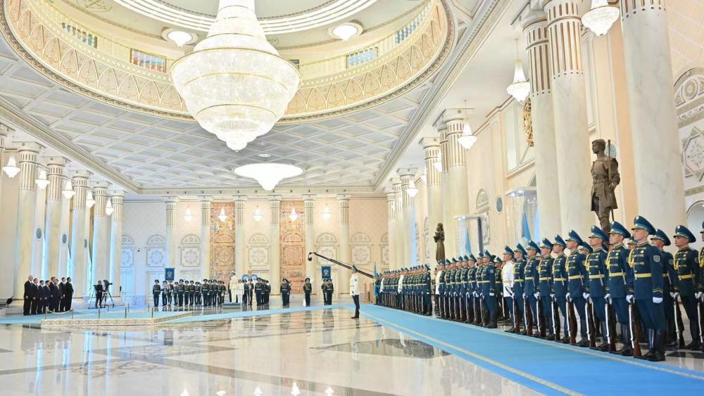 托卡耶夫?yàn)榱?xí)近平舉行隆重歡迎儀式。總統(tǒng)府大廳氣勢(shì)恢宏,禮兵威武挺拔。兩國元首分別同對(duì)方陪同人員一一握手致意。兩國元首登上檢閱臺(tái),軍樂團(tuán)奏中哈兩國國歌。習(xí)近平在托卡耶夫陪同下檢閱儀仗隊(duì)。