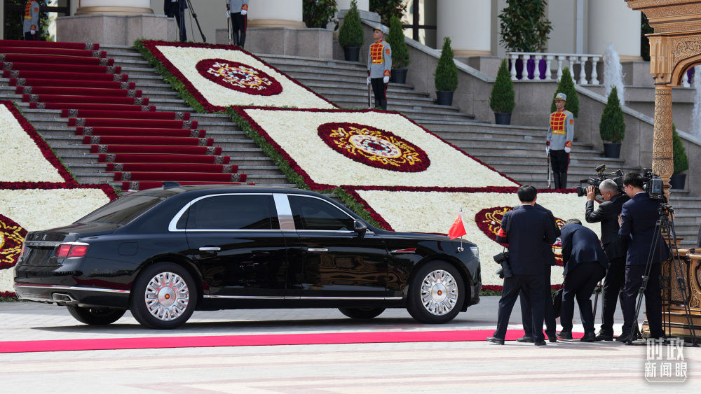 習主席乘坐的紅旗車抵達塔總統(tǒng)府。(總臺記者李晉拍攝)