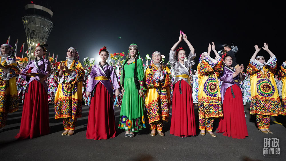 1500多名身著民族盛裝的塔吉克斯坦青年,表演富有濃郁特色的中塔歌舞,揮舞中塔兩國國旗,表達對中國領(lǐng)導人的熱烈歡迎。