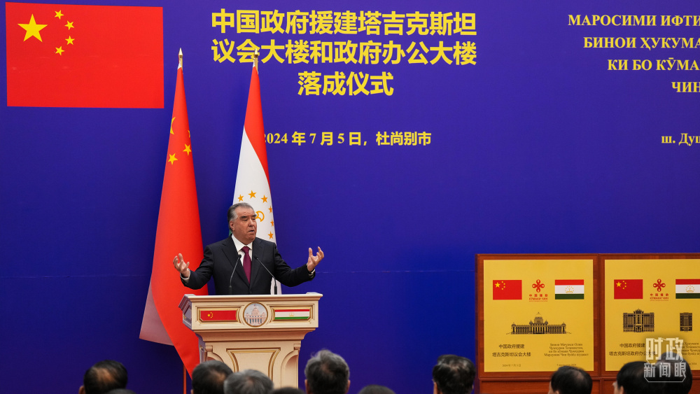 5日,拉赫蒙總統(tǒng)陪同習主席共同步入議會大樓。兩國元首參觀中方援塔議會大樓和政府大樓項目展板,共同為兩座大樓揭牌。