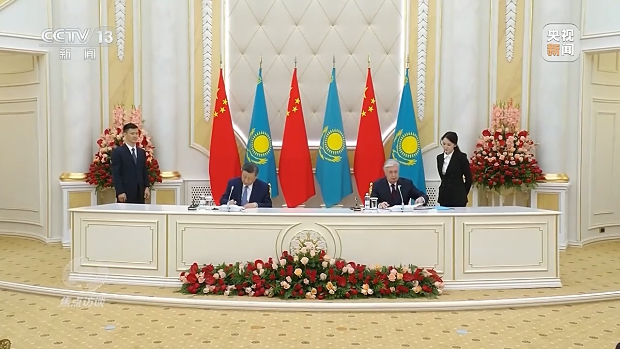 兩國元首共同簽署《中華人民共和國和哈薩克斯坦共和國聯(lián)合聲明》,見證簽署數(shù)十項合作文件并共同出席兩國文化中心和北京語言大學(xué)哈薩克斯坦分校揭牌儀式。