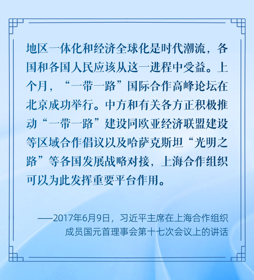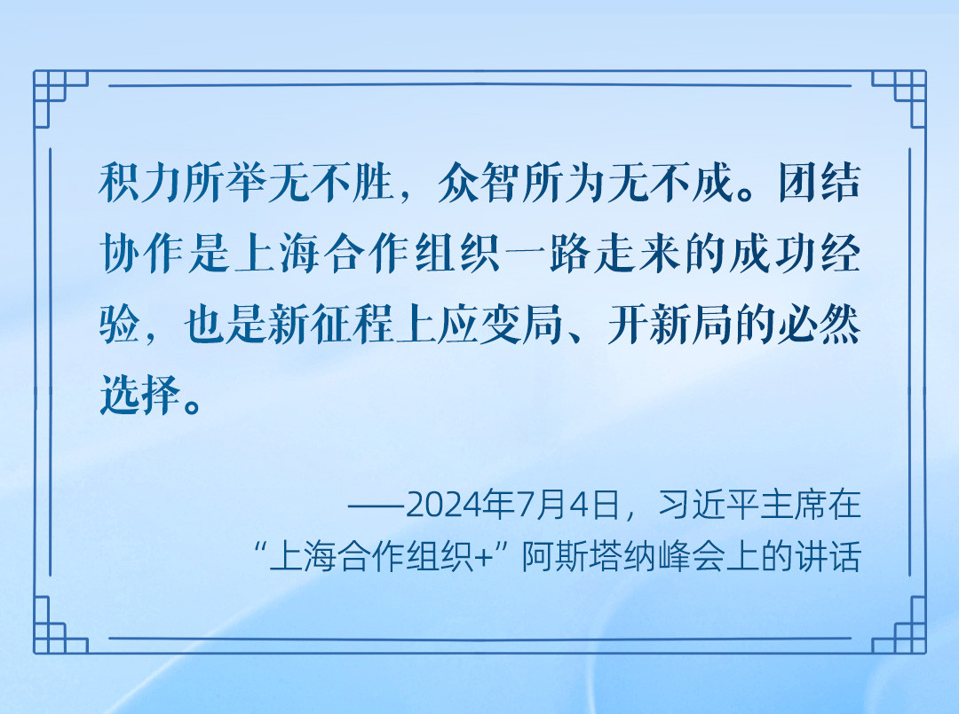 在上海合作組織這個世界上人口最多、幅員最遼闊的大家庭,好鄰居心連心、好朋友肩并肩、好伙伴手牽手,不斷拓展互利合作、共同發(fā)展的廣闊空間,朝著實現(xiàn)現(xiàn)代化的宏偉藍(lán)圖,在可持續(xù)發(fā)展之路上不斷邁進(jìn)。