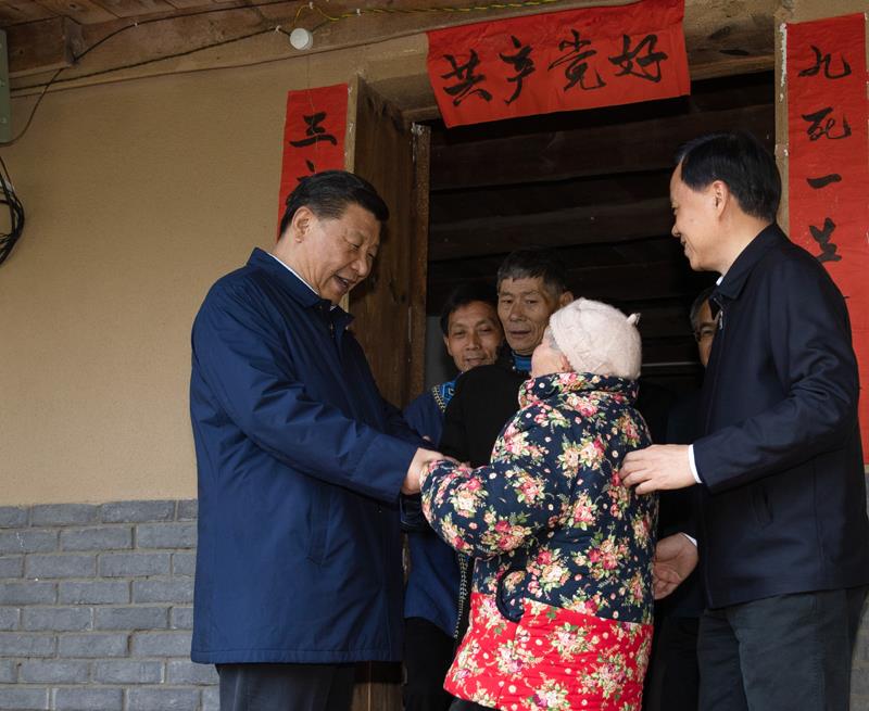 △2019年4月15日,習近平總書記在重慶石柱土家族自治縣中益鄉(xiāng)華溪村看望貧困戶譚登周一家。