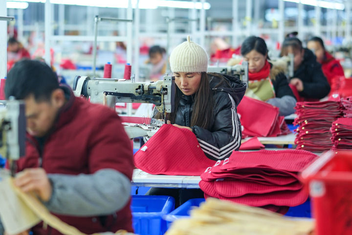 2024年1月18日,社區(qū)居民在紅安社區(qū)的鄉(xiāng)村振興就業(yè)車間工作。紅安社區(qū)是由易地搬遷安置區(qū)單獨(dú)成立的新社區(qū),位于湖南省湘西土家族苗族自治州鳳凰縣禾庫(kù)鎮(zhèn)。