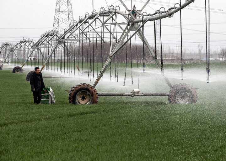 2024年3月18日,在河南省焦作市博愛(ài)縣孝敬鎮(zhèn)東原莊村瑞輝家庭農(nóng)場(chǎng),村民使用全自動(dòng)指針式噴灌機(jī)進(jìn)行澆灌作業(yè)。