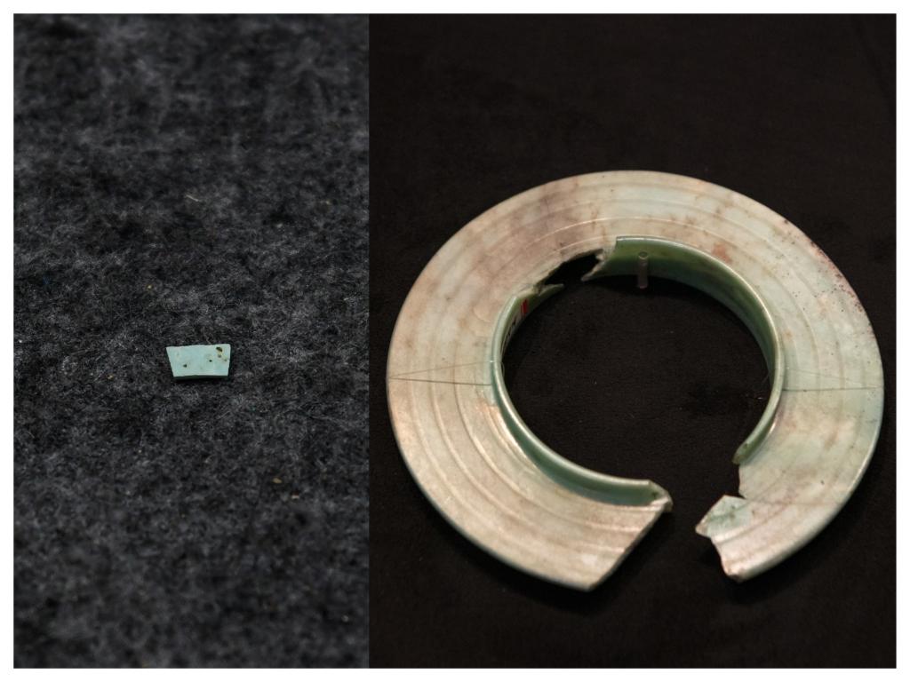 拼版照片:左圖為2024年7月10日拍攝的三星堆遺址出土的綠松石片(新華社記者王曦 攝),右圖為2024年7月21日在三星堆博物館文物保護與修復(fù)館拍攝的有領(lǐng)玉璧(新華社記者唐文豪 攝)。
