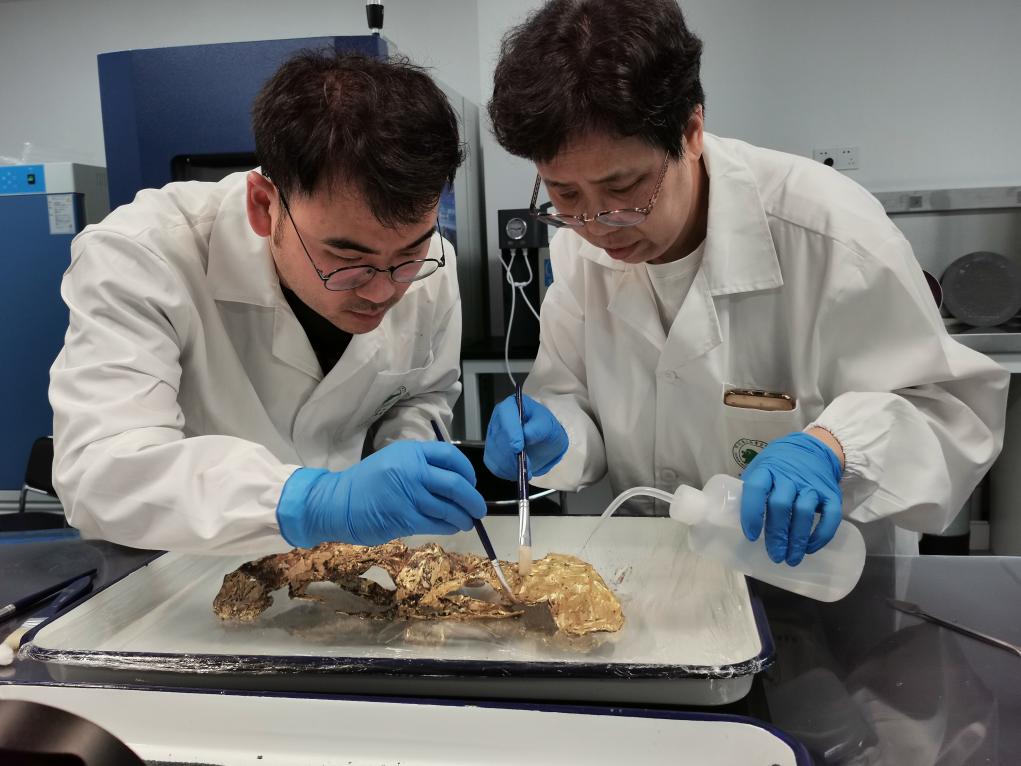 2023年7月,馬燕如(右)帶著魯海子(左)修復(fù)三星堆遺址出土的黃金面具。新華社發(fā)(四川省文物考古研究院供圖)