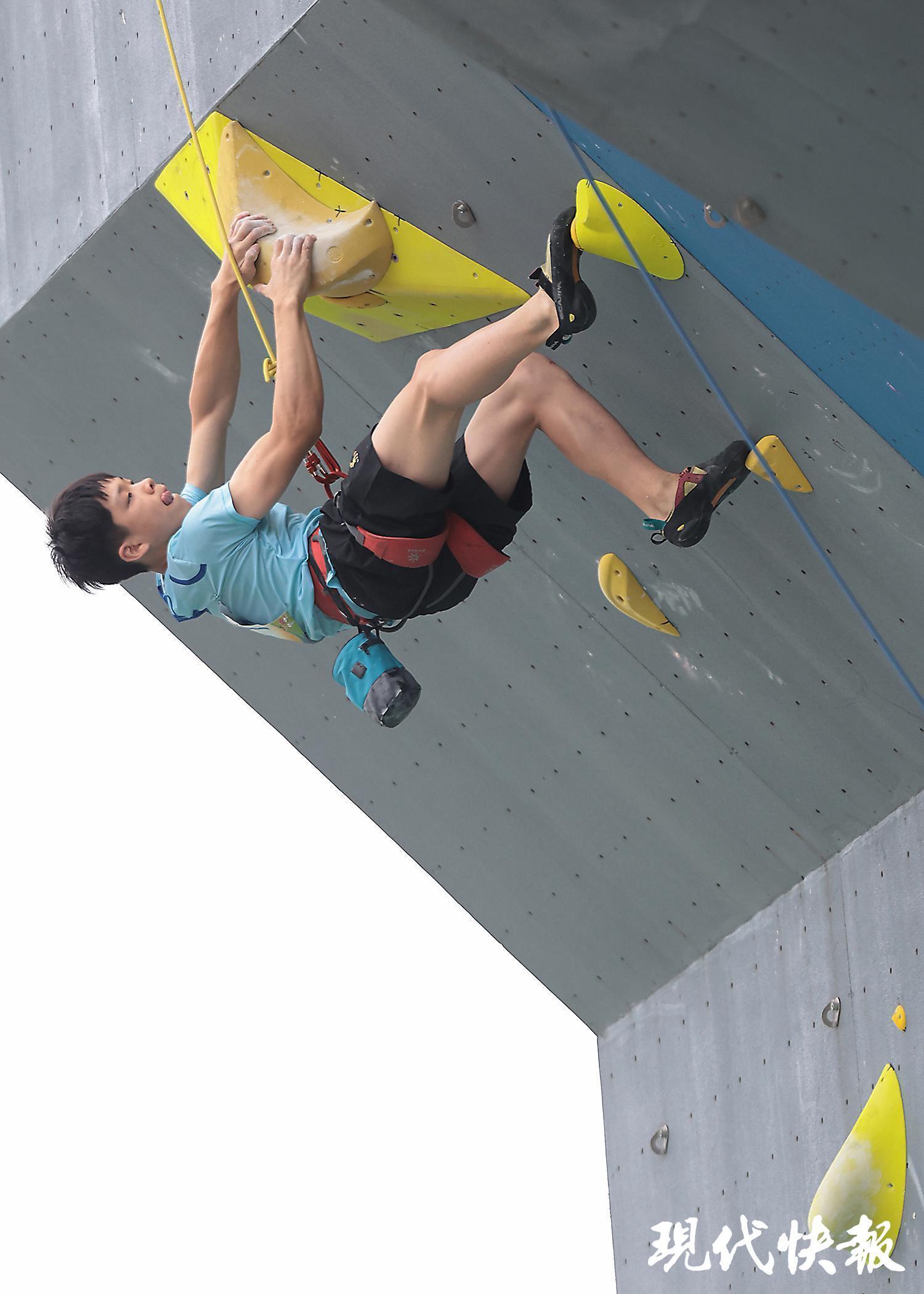 趙一程在江蘇省運會攀巖比賽上“飛檐走壁”