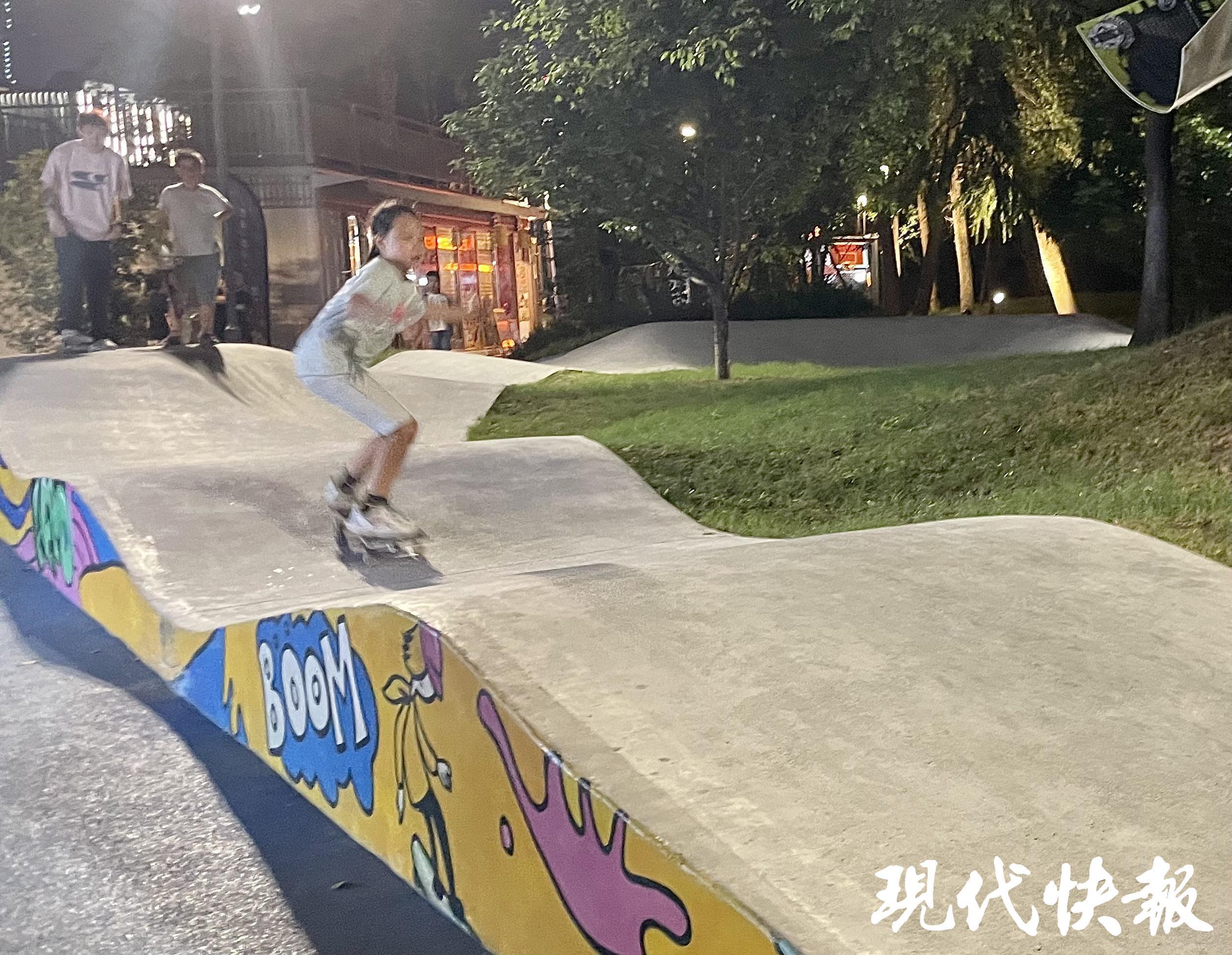 夜幕降臨,南京西城·夜未央的滑板場地上,一群青少年正在隨著起伏不定的坡道感受風的速度。