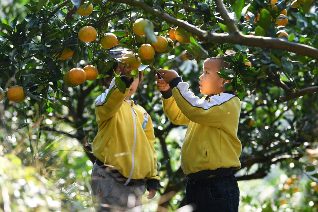 貴州黃平縣小朋友在校外勞動實(shí)踐基地采摘柑橘。
