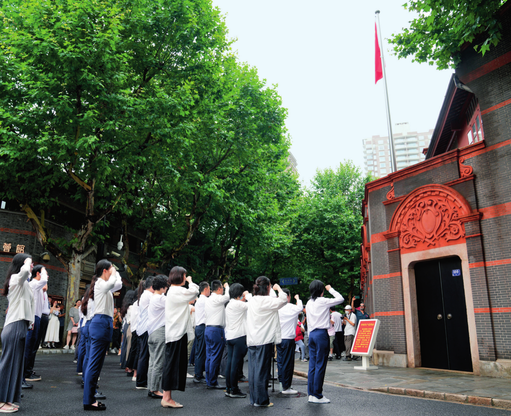 中共一大紀(jì)念館的黨員在一大會址前重溫入黨誓詞(2024年7月1日攝) 劉穎攝 / 本刊