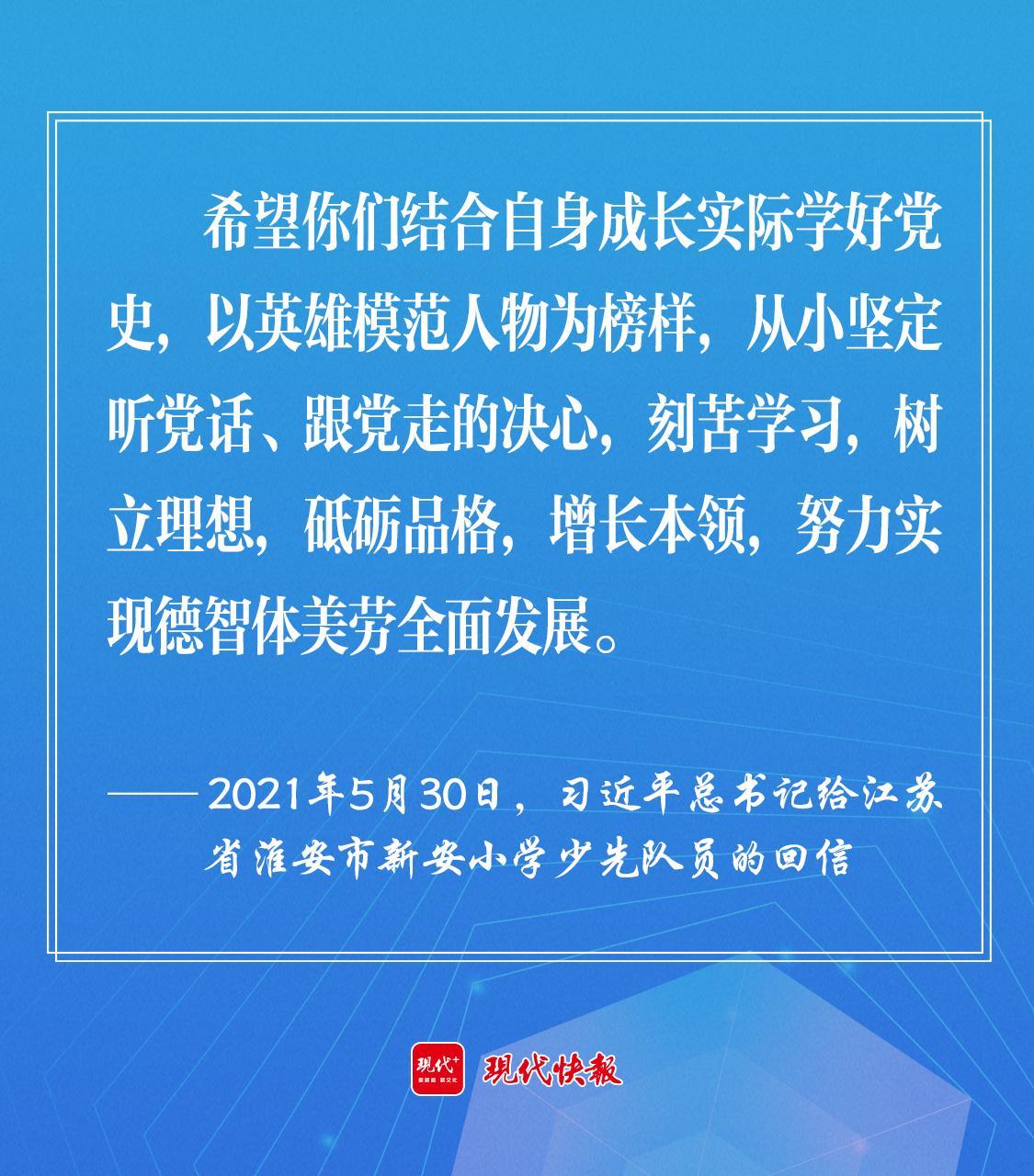 2021年5月30日,習(xí)近平總書記給江蘇省淮安市新安小學(xué)少先隊(duì)員回信時強(qiáng)調(diào),“希望你們結(jié)合自身成長實(shí)際學(xué)好黨史,以英雄模范人物為榜樣,從小堅定聽黨話、跟黨走的決心,刻苦學(xué)習(xí),樹立理想,砥礪品格,增長本領(lǐng),努力實(shí)現(xiàn)德智體美勞全面發(fā)展。”