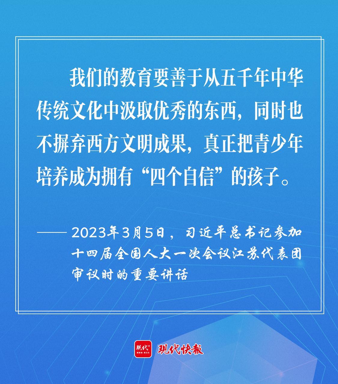 2023年3月5日,習(xí)近平總書記參加十四屆全國人大一次會議江蘇代表團(tuán)審議時,勉勵教育工作者“要善于從五千年中華傳統(tǒng)文化中汲取優(yōu)秀的東西,同時也不摒棄西方文明成果,真正把青少年培養(yǎng)成為擁有‘四個自信’的孩子?!?/p>