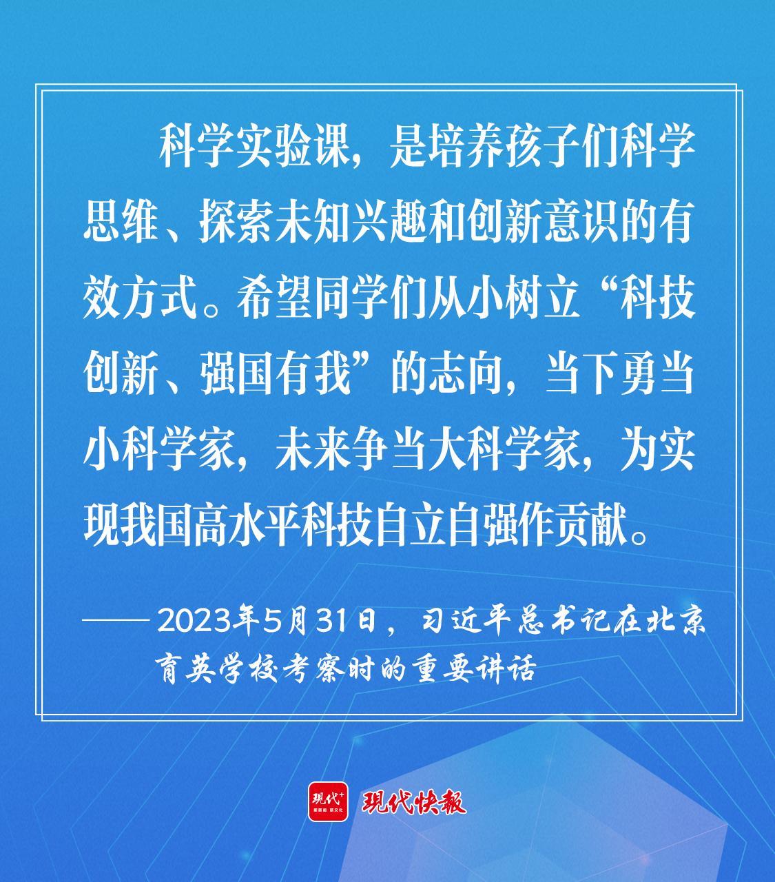 2023年5月,習(xí)近平總書記在北京育英學(xué)校考察時強(qiáng)調(diào),希望同學(xué)們從小樹立“科技創(chuàng)新、強(qiáng)國有我”的志向,當(dāng)下勇當(dāng)小科學(xué)家,未來爭當(dāng)大科學(xué)家,為實(shí)現(xiàn)我國高水平科技自立自強(qiáng)作貢獻(xiàn)。