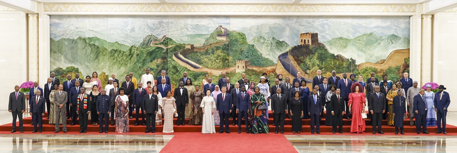 9月4日晚,國家主席習近平和夫人彭麗媛在北京人民大會堂舉行宴會,歡迎來華出席中非合作論壇北京峰會的非方及國際貴賓。這是宴會前,習近平和彭麗媛同貴賓們集體合影留念。新華社記者 丁林 攝