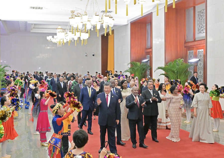 9月4日晚,國家主席習近平和夫人彭麗媛在北京人民大會堂舉行宴會,歡迎來華出席中非合作論壇北京峰會的非方及國際貴賓。這是在前往宴會廳沿途,少年兒童對國際貴賓表示熱烈歡迎。新華社記者 張領(lǐng) 攝