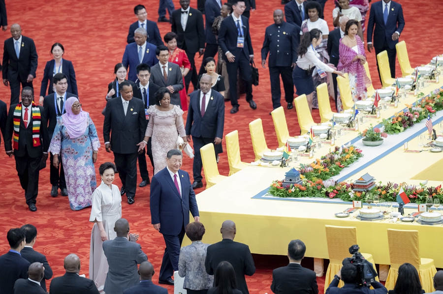 9月4日晚,國家主席習近平和夫人彭麗媛在北京人民大會堂舉行宴會,歡迎來華出席中非合作論壇北京峰會的非方及國際貴賓。這是習近平和彭麗媛同貴賓們共同步入宴會廳。新華社記者 劉彬 攝
