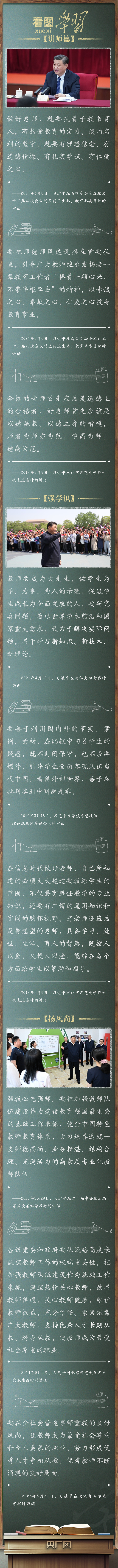 教育大計(jì),教師為本。黨的十八大以來,以習(xí)近平同志為核心的黨中央堅(jiān)持把教育擺在優(yōu)先發(fā)展的戰(zhàn)略位置,推動新時(shí)代教育事業(yè)取得歷史性成就、發(fā)生格局性變化。習(xí)近平總書記緊扣“培養(yǎng)什么人、怎樣培養(yǎng)人、為誰培養(yǎng)人”這一教育的根本問題,對建設(shè)新時(shí)代高素質(zhì)專業(yè)化教師隊(duì)伍作出一系列重要指示,激勵廣大教師立德修身、敬業(yè)立學(xué),強(qiáng)調(diào)要在全黨全社會弘揚(yáng)尊師重教的社會風(fēng)尚。在第四十個教師節(jié)到來之際,讓我們一起牢記并踐行總書記的殷殷囑托!