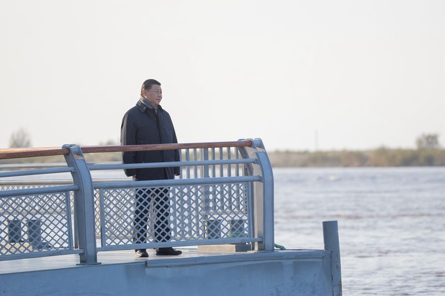 2021年10月20日,中共中央總書記、國家主席、中央軍委主席習近平在東營市黃河入??诳疾臁P氯A社記者 王曄 攝