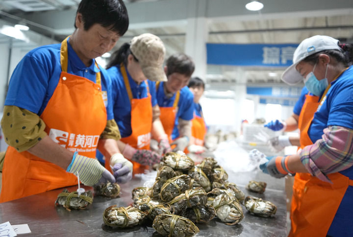 山東省東營市墾利區(qū)的一處大閘蟹加工車間的工作人員對新鮮的大閘蟹進行分選和捆扎(2024年9月10日攝)。新華社記者 徐速繪 攝