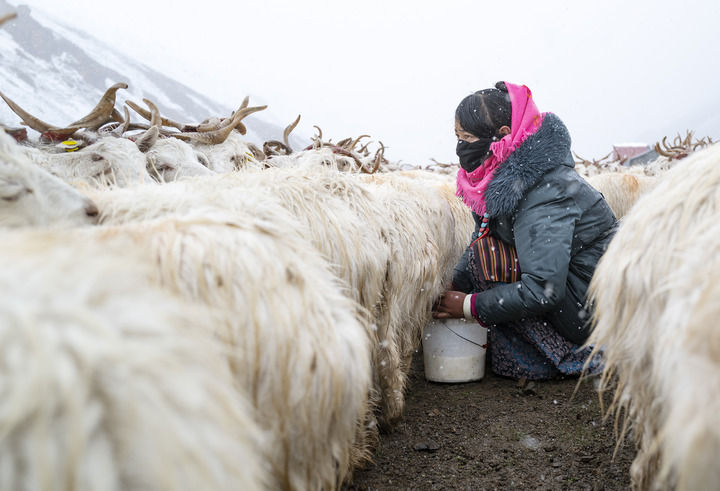 在西藏阿里地區(qū)日土縣龍門卡村白絨山羊擴繁場,飼養(yǎng)員在給白絨山羊擠奶(2024年9月13日攝)。新華社記者 孫瑞博 攝